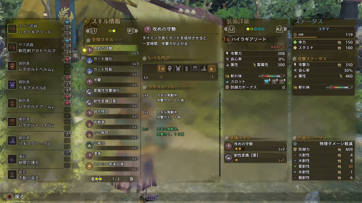 ※護石は防具1スロ×1 攻めの守勢3 弱点特攻1